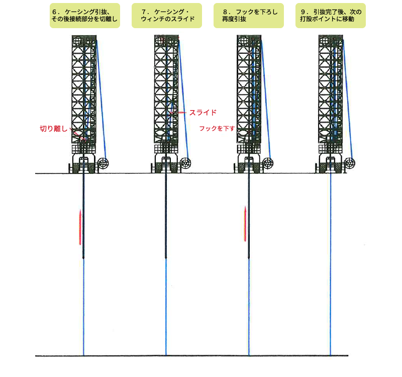 打設手順(継杭式) 高さ制限のある現場での施工に用います。 継杭式(1回)施工フロー ![]() |
