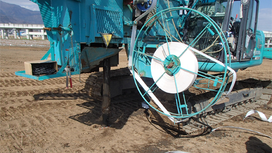 ジオドレーン工法は軟弱地盤中に人工の鉛直ドレーンを打設し、水平ドレーンと組合せることで一体としてドレーン機能を果たし圧密促進する工法です。従来のペーパードレーン工法の一種でサンドマットを使用せずに、環境に優しい工法です。